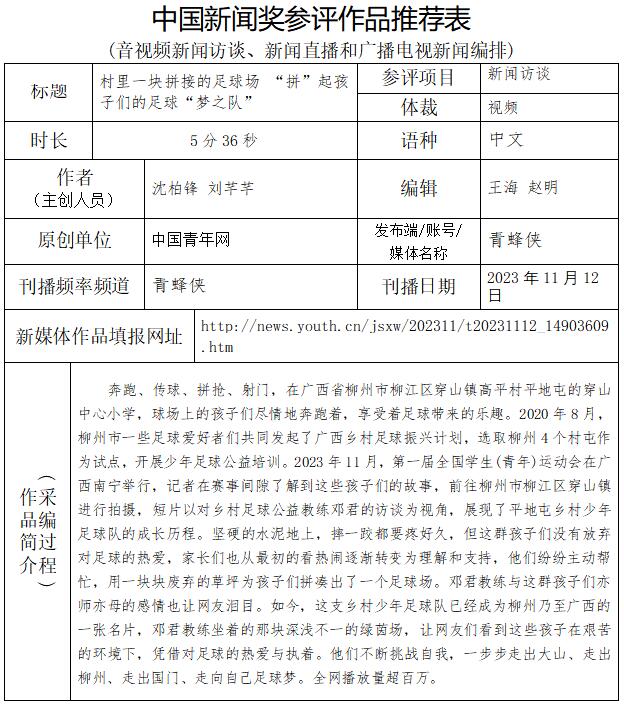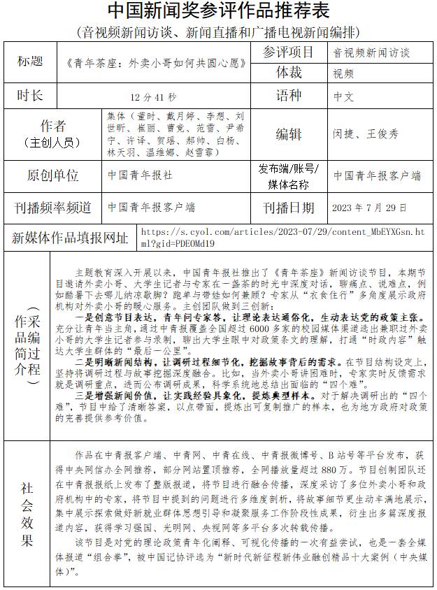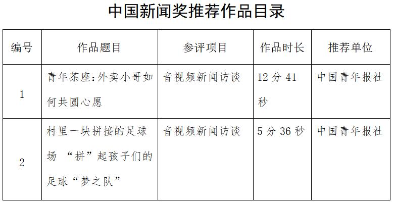 中國(guó)青年報(bào)社推薦參評(píng)第34屆中國(guó)新聞獎(jiǎng)音視頻新聞訪談、音視頻新聞直播等作品專項(xiàng)初評(píng)公示