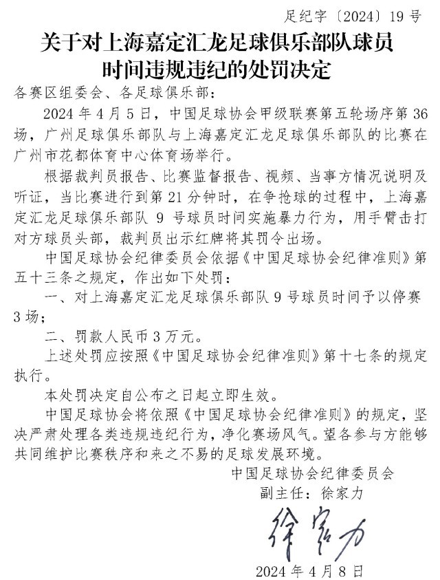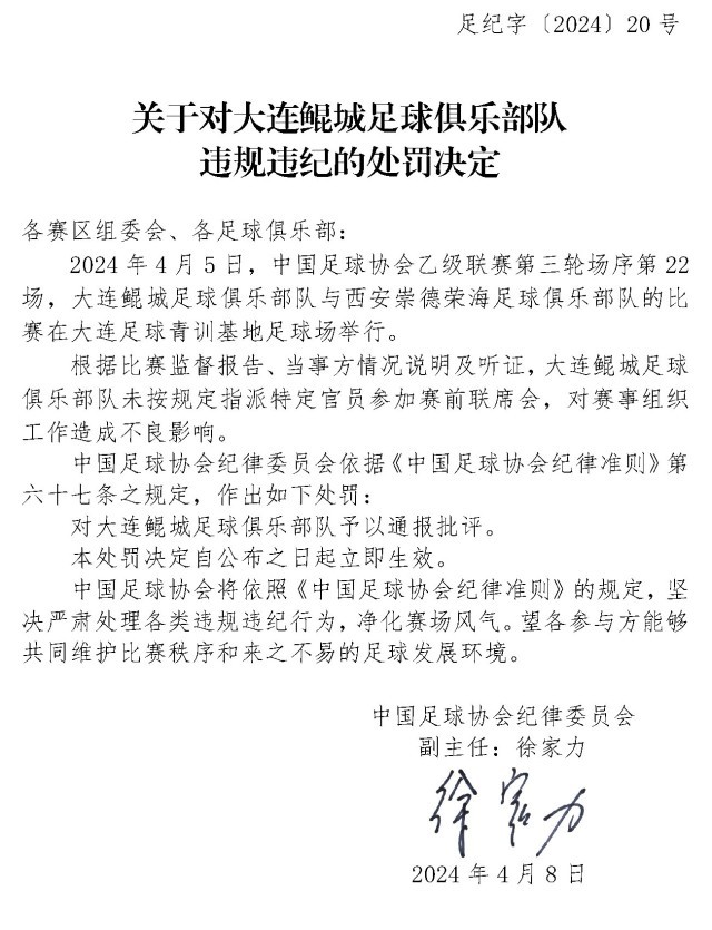 央視網(wǎng)消息:4月10日,中國足協(xié)網(wǎng)站發(fā)布《關(guān)于對上海嘉定匯龍足球俱樂部隊球員時間違規(guī)違紀(jì)的處罰決定》《關(guān)于對西安崇德榮海足球俱樂部隊違規(guī)違紀(jì)的處罰決定》《關(guān)于對大連鯤城足球俱樂部隊違規(guī)違紀(jì)的處罰決定》三份處罰決定。中甲聯(lián)賽上海嘉定匯龍9號球員因暴力行為被停賽罰款。中乙聯(lián)賽大連鯤城與西安崇德榮海兩家俱樂部因未按規(guī)定指派特定官員參加賽前聯(lián)席會,被通報批評。