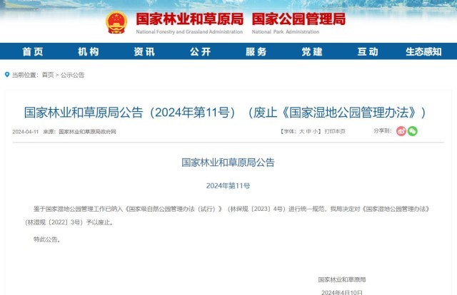 央視網(wǎng)消息:國家林業(yè)和草原局發(fā)布公告2024年第11號,鑒于國家濕地公園管理工作已納入《國家級自然公園管理辦法(試行)》(林保規(guī)〔2023〕4號)進(jìn)行統(tǒng)一規(guī)范,決定對《國家濕地公園管理辦法》(林濕規(guī)〔2022〕3號)予以廢止。