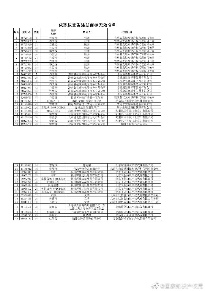 中新網(wǎng)2月14日電 國家知識產(chǎn)權(quán)局14日在其官方微博發(fā)布聲明稱,國家知識產(chǎn)權(quán)局對惡意搶注北京2022年冬奧會和冬殘奧會吉祥物、運動健兒姓名等行為予以堅決打擊,依據(jù)《奧林匹克標(biāo)志保護(hù)條例》、《商標(biāo)法》第十條第一款第(八)項等規(guī)定,對第41128524號“冰墩墩”、第62453532號“谷愛凌”等429件商標(biāo)注冊申請予以駁回;依據(jù)《商標(biāo)法》第四十四條第一款規(guī)定,對已注冊的第41126916號“雪墩墩”、第38770198號 “谷愛凌”等43件商標(biāo)依職權(quán)主動宣告無效。