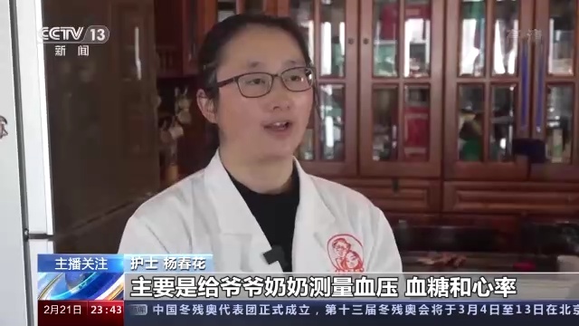 護(hù)士 楊春花:每個星期來一次的,主要是給爺爺奶奶測量血壓,血糖和心率,幫他做一下藥物的管理。