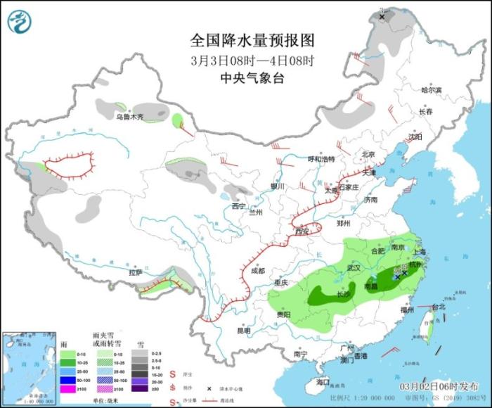 3月3日08時(shí)至4日08時(shí),內(nèi)蒙古東北部、黑龍江西北部、新疆沿天山地區(qū)等地部分地區(qū)有小到中雪(2.5~3毫米)。江淮大部、江漢東部、江南大部、西南地區(qū)東南部、廣西東北部等地部分地區(qū)有小到中雨,其中,江西北部、浙江中部等地部分地區(qū)有大雨(25~35毫米)。內(nèi)蒙古、遼寧、新疆東部、陜西北部、山西中部、河北北部、山東半島等地部分地區(qū)有4~6級風(fēng),其中,內(nèi)蒙古西北部部分地區(qū)有6~7級風(fēng)。