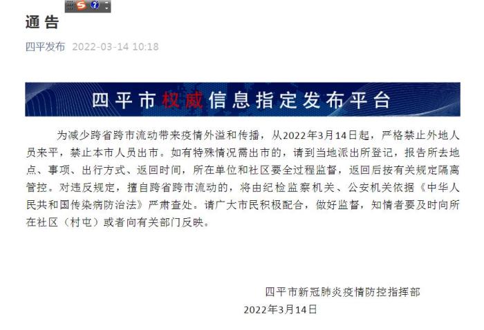 中新網(wǎng)3月14日電 據(jù)“四平發(fā)布”微信公眾號消息,14日,吉林省四平市新冠肺炎疫情防控指揮部發(fā)布通告,為減少跨省跨市流動帶來疫情外溢和傳播,從2022年3月14日起,嚴格禁止外地人員來平,禁止本市人員出市。如有特殊情況需出市的,請到當?shù)嘏沙鏊怯?,報告所去地點、事項、出行方式、返回時間,所在單位和社區(qū)要全過程監(jiān)督,返回后按有關(guān)規(guī)定隔離管控。對違反規(guī)定,擅自跨省跨市流動的,將由紀檢監(jiān)察機關(guān)、公安機關(guān)依據(jù)《中華人民共和國傳染病防治法》嚴肅查處。請廣大市民積極配合,做好監(jiān)督,知情者要及時向所在社區(qū)(村屯)或者向有關(guān)部門反映。