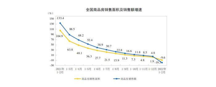 1—2月份,商品房銷售面積15703萬平方米,同比下降9.6%,其中,住宅銷售面積下降13.8%;商品房銷售額15459億元,下降19.3%,其中,住宅銷售額下降22.1%。