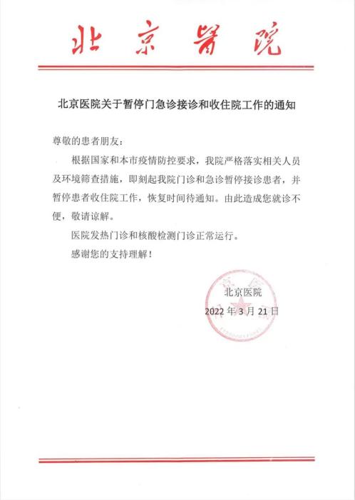中新網(wǎng)3月21日電 據(jù)北京醫(yī)院微信公眾號(hào)21日消息,根據(jù)國(guó)家和北京市疫情防控要求,該醫(yī)院嚴(yán)格落實(shí)相關(guān)人員及環(huán)境篩查措施,即刻起該醫(yī)院門診和急診暫停接診患者,并暫?;颊呤兆≡汗ぷ?,恢復(fù)時(shí)間另行通知。發(fā)熱門診和核酸檢測(cè)門診正常運(yùn)行。通知如下: