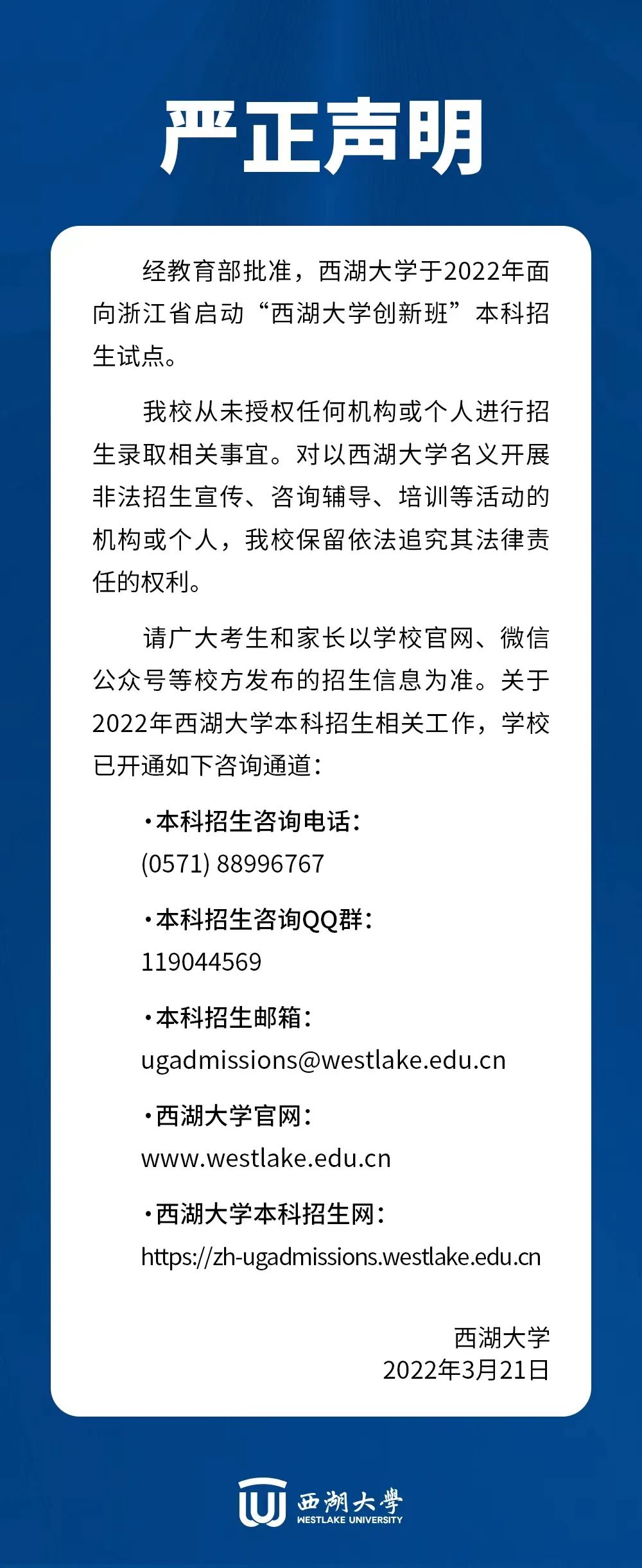 中新網(wǎng)3月21日電 據(jù)“西湖大學WestlakeUniversity”微信公眾號消息,3月21日,西湖大學發(fā)布《關(guān)于2022年西湖大學本科招生的嚴正聲明》,聲明指出,經(jīng)教育部批準,西湖大學于2022年面向浙江省啟動“西湖大學創(chuàng)新班”本科招生試點。該校從未授權(quán)任何機構(gòu)或個人進行招生錄取相關(guān)事宜。對以西湖大學名義開展非法招生宣傳、咨詢輔導(dǎo)、培訓(xùn)等活動的機構(gòu)或個人,該校保留依法追究其法律責任的權(quán)利。
