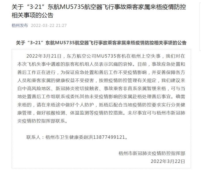 中新網(wǎng)3月22日電 據(jù)“梧州發(fā)布”微信公眾號消息,3月22日,梧州市新冠肺炎疫情防控指揮部發(fā)布通告稱,2022年3月21日,東方航空公司MU5735客機在梧州上空失事。目前,事故應(yīng)急處置和善后工作正在進行,為保證應(yīng)急處置和善后工作不受疫情影響,并妥善保障各方人員和乘客家屬的健康權(quán)益不受侵害,按照疫情防控管理有關(guān)規(guī)定,我們建議來自中高風(fēng)險地區(qū)、新冠肺炎密切接觸者、事故乘客非直系親屬暫緩來梧,可與當(dāng)?shù)靥幹蒙坪蠊ぷ鹘M聯(lián)系或委托其他未受疫情影響的家屬赴梧處理善后事宜。