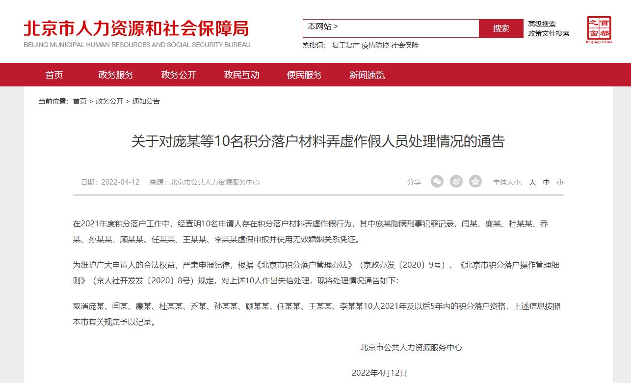 中新網(wǎng)4月12日電 北京市人社局網(wǎng)站12日發(fā)布通告指出,在2021年度積分落戶(hù)工作中,經(jīng)查明10名申請(qǐng)人存在積分落戶(hù)材料弄虛作假行為,取消龐某等10人2021年及以后5年內(nèi)的積分落戶(hù)資格。