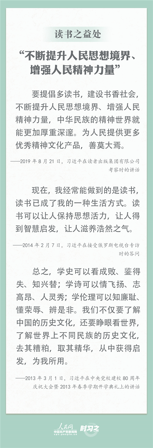 讀書滋養(yǎng)美好心靈。習(xí)近平總書記曾多次談及讀書的好處,“人民群眾多讀書,我們的民族精神就會厚重起來、深邃起來” 。4月23日是世界讀書日,跟習(xí)近平總書記學(xué)讀書之道,讓學(xué)習(xí)點(diǎn)亮生活,讓全民閱讀蔚然成風(fēng)。