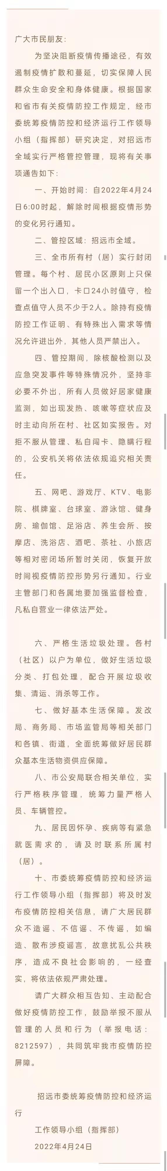 4月24日,山東煙臺招遠市委統(tǒng)籌疫情防控和經(jīng)濟運行工作領(lǐng)導小組(指揮部)發(fā)布《關(guān)于全域?qū)嵤﹪栏窆芸毓芾淼耐ǜ妗?。通告指出,?022年4月24日6時起,招遠市所有村(居)實行封閉管理。每個村、居民小區(qū)原則上只保留一個出入口,卡口24小時值守,檢查點值守人員不少于2人。除持有疫情防控工作證明、有特殊出入需求等情況允許進出外,其他人員嚴禁出入。