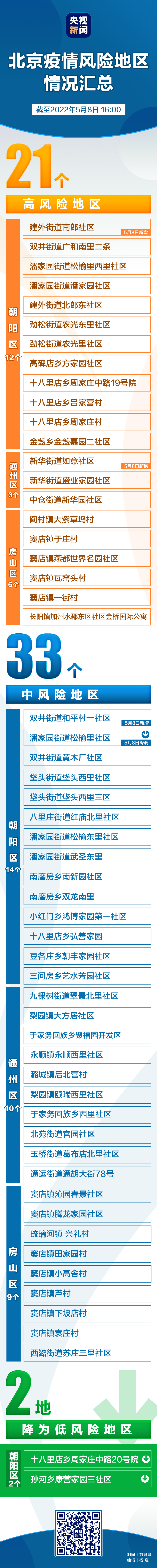 截至目前,北京全市共有高風險地區(qū)21個,中風險地區(qū)33個。