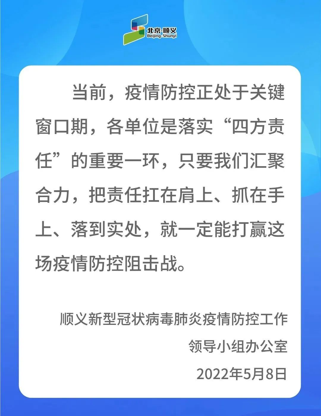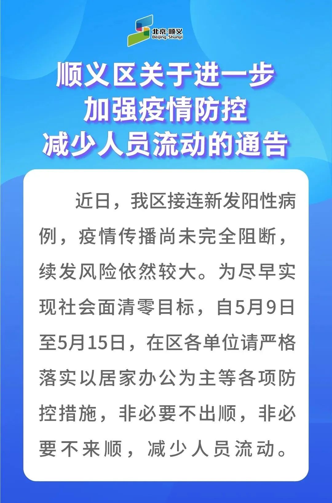 中新網(wǎng)5月8日電 據(jù)“北京順義”微信公眾號(hào)消息,5月8日,順義區(qū)發(fā)布《順義區(qū)關(guān)于進(jìn)一步加強(qiáng)疫情防控減少人員流動(dòng)的通告》指出,為盡早實(shí)現(xiàn)社會(huì)面清零目標(biāo),自5月9日至5月15日,在區(qū)各單位請(qǐng)嚴(yán)格落實(shí)以居家辦公為主等各項(xiàng)防控措施,非必要不出順,非必要不來(lái)順,減少人員流動(dòng)。