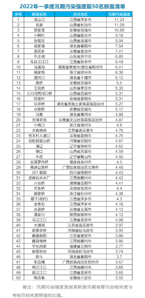扣除自然因素影響,全國(guó)25個(gè)劣Ⅴ類斷面分布在12個(gè)省份。其中,云南省數(shù)量最多,為7個(gè)。22個(gè)水質(zhì)明顯惡化斷面分布在13個(gè)省份。其中,安徽省數(shù)量最多,為4個(gè)。全國(guó)汛期污染強(qiáng)度較大的前50個(gè)斷面分布在15個(gè)省份,江西、湖北、云南省數(shù)量較多,占比為42.0%。其中,江西省萍鄉(xiāng)市龍山口斷面、山西省長(zhǎng)治市北寨斷面、安徽省宣城市管家渡斷面汛期污染強(qiáng)度位于全國(guó)前三名。