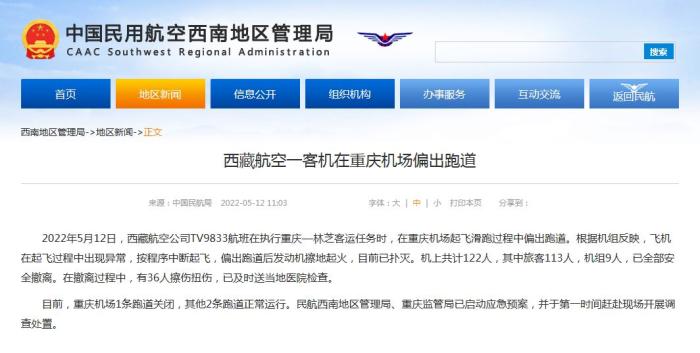 中新網(wǎng)5月12日電 據(jù)民航局網(wǎng)站消息,民航局今日就西藏航空一客機(jī)在重慶機(jī)場(chǎng)偏出跑道發(fā)布通報(bào)。通報(bào)稱,2022年5月12日,西藏航空公司TV9833航班在執(zhí)行重慶—林芝客運(yùn)任務(wù)時(shí),在重慶機(jī)場(chǎng)起飛滑跑過程中偏出跑道。根據(jù)機(jī)組反映,飛機(jī)在起飛過程中出現(xiàn)異常,按程序中斷起飛,偏出跑道后發(fā)動(dòng)機(jī)擦地起火,目前已撲滅。機(jī)上共計(jì)122人,其中旅客113人,機(jī)組9人,已全部安全撤離。在撤離過程中,有36人擦傷扭傷,已及時(shí)送當(dāng)?shù)蒯t(yī)院檢查。