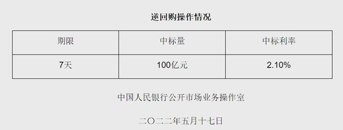 央行5月17日開(kāi)展100億元逆回購(gòu)操作 中標(biāo)利率2.10%