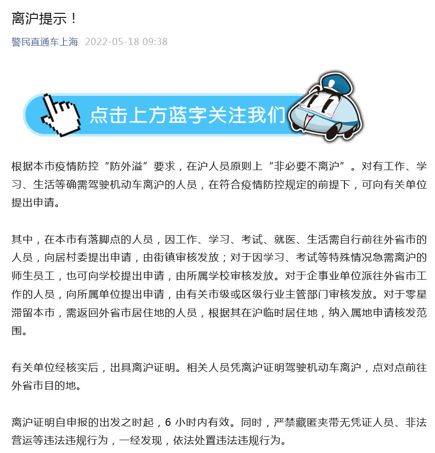 上海:確需駕車(chē)離滬人員可提出申請(qǐng) 離滬證明6小時(shí)內(nèi)有效