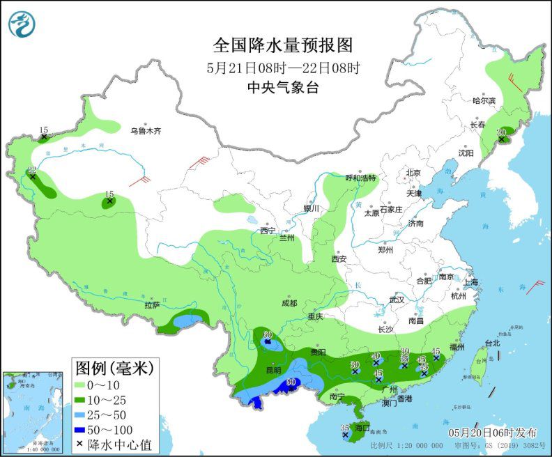 5月20日8時至21日8時,西藏北部、青海南部的部分地區(qū)有小到中雪或雨夾雪;云南中東部和南部、四川南部、廣西西部和中部、福建東部、海南島等地的部分地區(qū)有中雨,局地大雨(25~45毫米)。新疆南疆盆地等地的部分地區(qū)有4~6級風。
