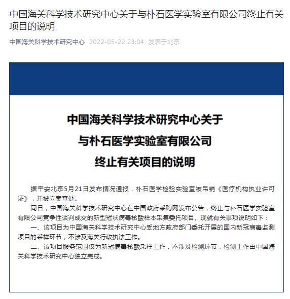 中新網(wǎng)5月23日電 中國海關科學技術研究中心22日在其微信公眾號發(fā)布關于與樸石醫(yī)學實驗室有限公司終止有關項目的說明稱,據(jù)平安北京5月21日發(fā)布情況通報,樸石醫(yī)學檢驗實驗室被吊銷《醫(yī)療機構執(zhí)業(yè)許可證》,并被立案查處。同日,中國海關科學技術研究中心在中國政府采購網(wǎng)發(fā)布公告,終止與樸石醫(yī)學實驗室有限公司競爭性談判成交的新型冠狀病毒核酸樣本采集委托項目。