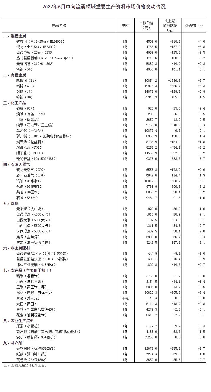 中新財經(jīng)6月24日電 6月24日,國家統(tǒng)計局發(fā)布6月中旬流通領(lǐng)域重要生產(chǎn)資料市場價格變動情況。對全國流通領(lǐng)域9大類50種重要生產(chǎn)資料市場價格的監(jiān)測顯示,2022年6月中旬與6月上旬相比,18種產(chǎn)品價格上漲,30種下降,2種持平。其中,生豬(外三元)價格為16.4元/千克,與上期價格相比,每公斤上漲0.6元,上漲幅度為3.8%。(完)