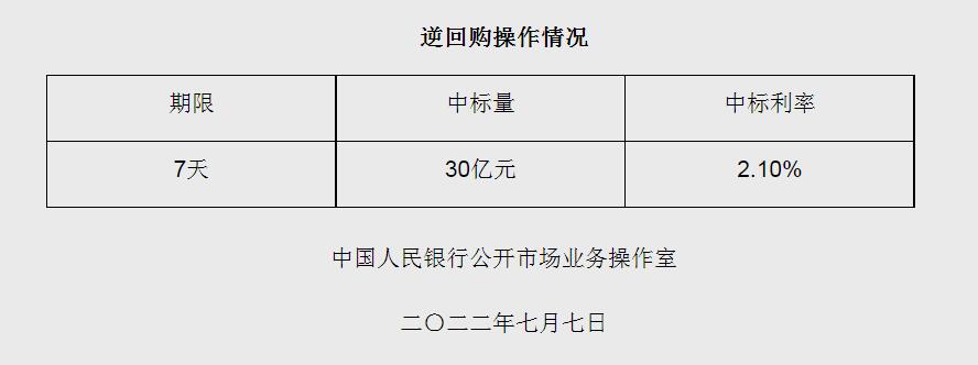 央行7月7日開展30億元逆回購操作 中標利率2.10%