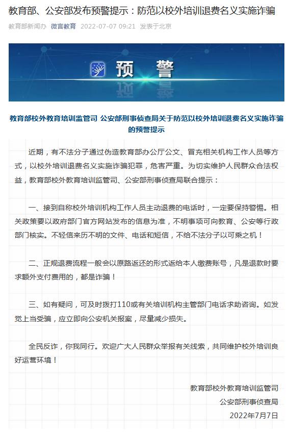 兩部門發(fā)布預(yù)警提示:防范以校外培訓(xùn)退費名義實施詐騙