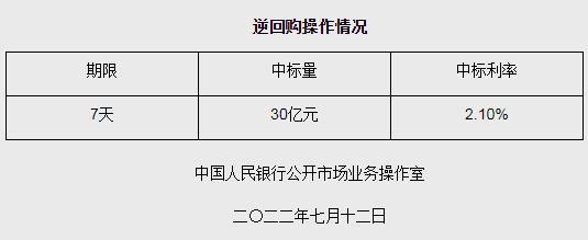 央行7月12日開展30億元逆回購操作 中標利率2.10%