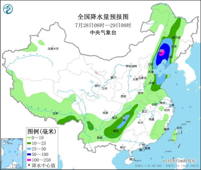 圖4 全國降水量預(yù)報(bào)圖(7月28日08時(shí)-29日08時(shí))