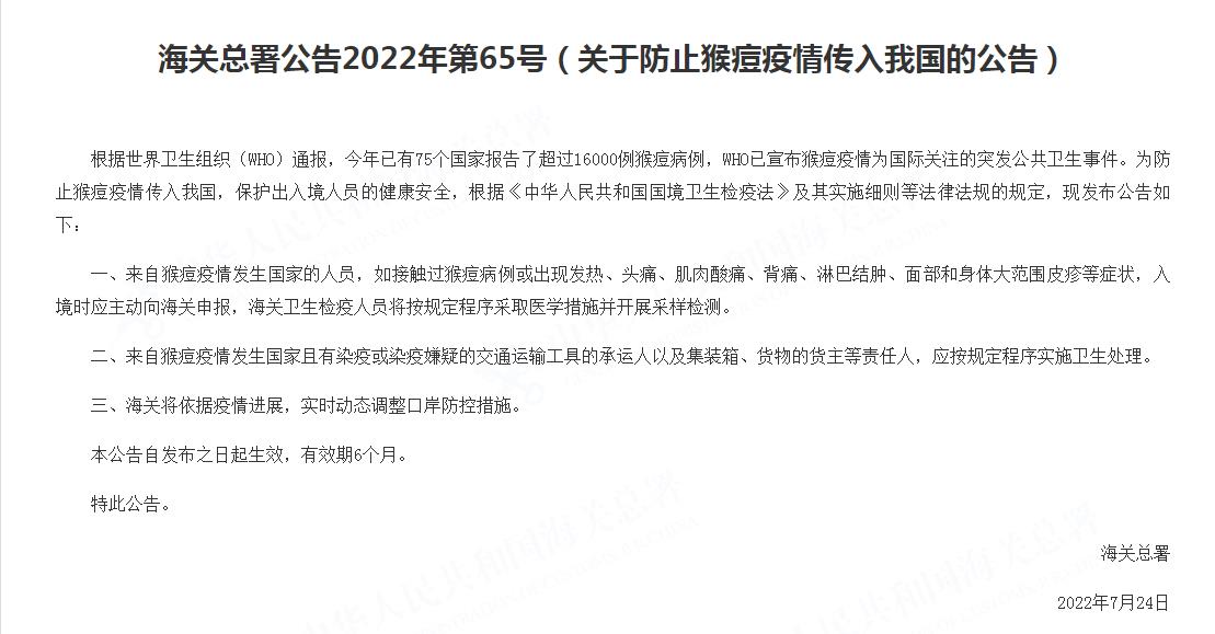 海關(guān)總署發(fā)布關(guān)于防止猴痘疫情傳入我國的公告