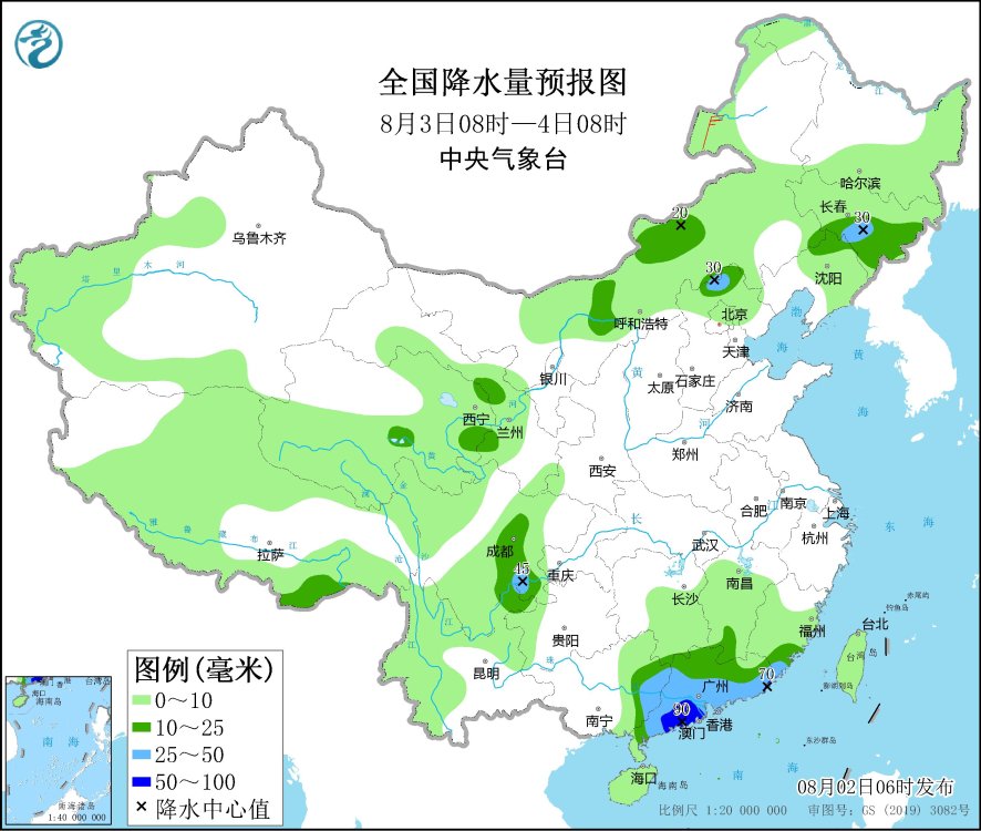 8月3日08時至4日08時,內(nèi)蒙古中部、河北北部、吉林東部、遼寧北部、四川盆地西部和南部、廣西東部、廣東大部、福建東南部等地部分地區(qū)有中到大雨,其中,廣東西南部和東部沿海等地部分地區(qū)有暴雨(50~90毫米)。內(nèi)蒙古東北部部分地區(qū)有4~5級風(fēng)。