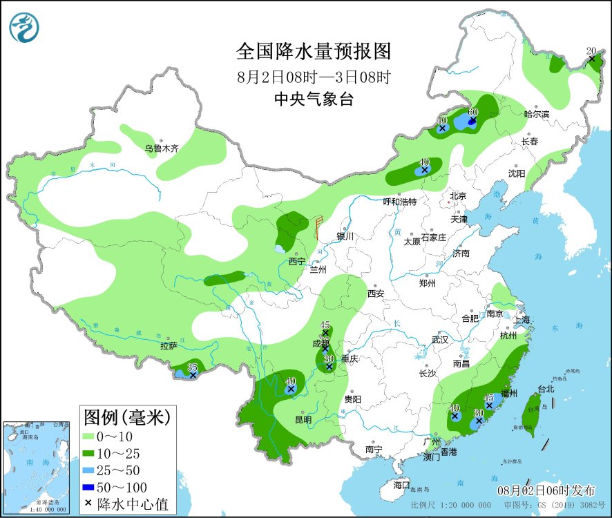 8月2日08時至3日08時,青海北部和南部、內(nèi)蒙古中東部、黑龍江東北部、四川中部和南部、云南西部、江西東南部、浙江東南部、福建東部和南部、廣東東部、臺灣島等地部分地區(qū)有中到大雨,局地暴雨(50~60毫米)。內(nèi)蒙古西部部分地區(qū)有4~5級風(fēng)。