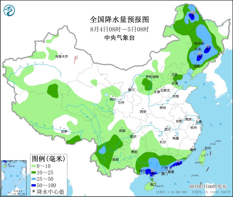 8月4日08時至5日08時,內(nèi)蒙古東北部、東北地區(qū)大部、四川南部、云南中部和西北部、廣西大部、廣東大部等地有中到大雨,其中,內(nèi)蒙古東北部、黑龍江西北部和東南部、吉林中部、遼寧北部、廣西東南部沿海、廣東西南部和東部沿海等地部分地區(qū)有暴雨(50~90毫米)。黑龍江西北部部分地區(qū)有4~6級風(fēng)。