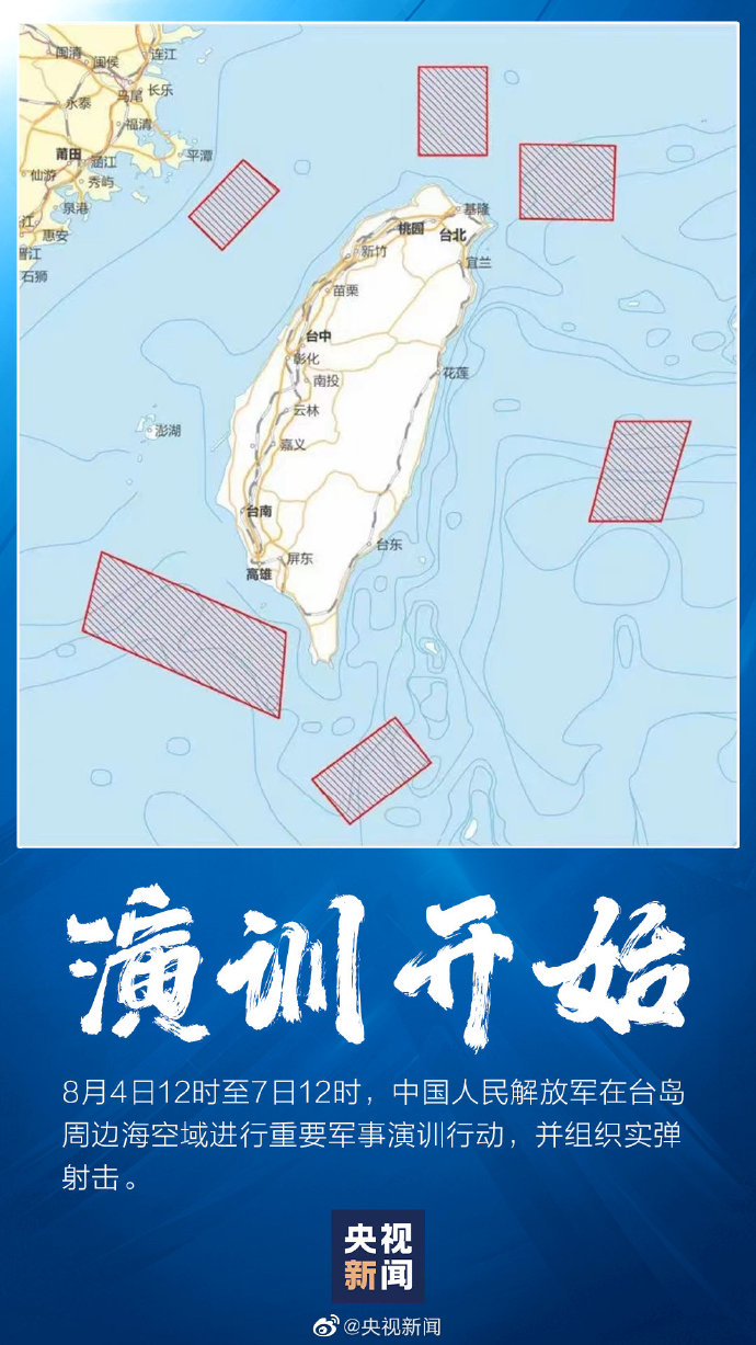 今日12時至7日12時,解放軍重要軍事演訓(xùn)行動進(jìn)行,并組織實(shí)彈射擊。此次實(shí)戰(zhàn)演訓(xùn)選擇環(huán)島六大區(qū)域,在此期間,有關(guān)船只和飛行器不要進(jìn)入有關(guān)海域和空域!