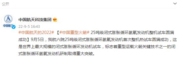 中國(guó)重型火箭25噸級(jí)閉式膨脹循環(huán)氫氧發(fā)動(dòng)機(jī)整機(jī)試車圓滿成功