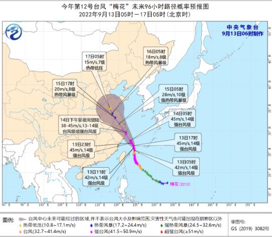大風(fēng)預(yù)報(bào):9月13日8時(shí)至14日8時(shí),巴士海峽、臺(tái)灣海峽北部、臺(tái)灣以東洋面、黃海西南部海域、東海大部及釣魚島附近海域、長(zhǎng)江口區(qū)、杭州灣以及臺(tái)灣島北部和東部沿海、浙江沿海、福建北部沿海、上海沿海、江蘇東南部沿海將有6-8級(jí)大風(fēng),陣風(fēng)9-11級(jí),其中東海部分海域?qū)⒂?-11級(jí)大風(fēng),陣風(fēng)12-14級(jí),“梅花”中心經(jīng)過的附近海面的風(fēng)力有12-14級(jí),陣風(fēng)可達(dá)15-16級(jí)。
