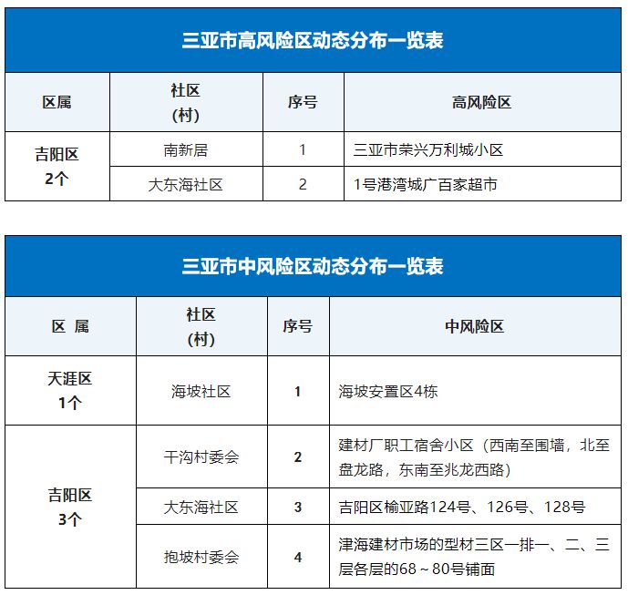 9月19日,記者從海南省三亞市新型冠狀病毒肺炎疫情防控工作指揮部獲悉,根據(jù)當前三亞市疫情防控工作需要,按照國務院應對新型冠狀病毒肺炎疫情聯(lián)防聯(lián)控機制綜合組《新型冠狀病毒肺炎防控方案(第九版)》相關規(guī)定,經(jīng)專家組研判,三亞市疫情防控指揮部決定,將紅旗街社區(qū)椰風巷79、81、83號樓等區(qū)域調整為低風險區(qū),自通告發(fā)布起,高風險區(qū)調整為2個、中風險區(qū)調整為4個(見附表)。除高、中風險區(qū)外的區(qū)域為低風險區(qū)。
