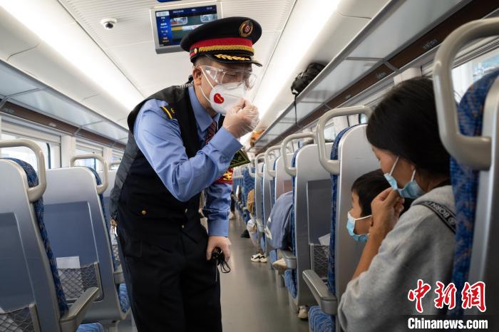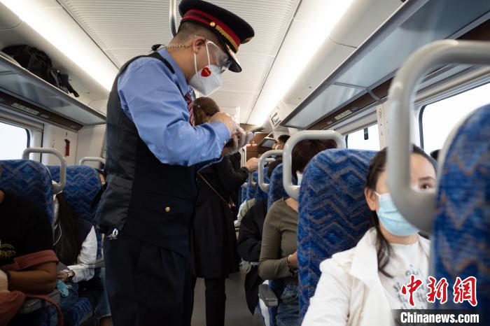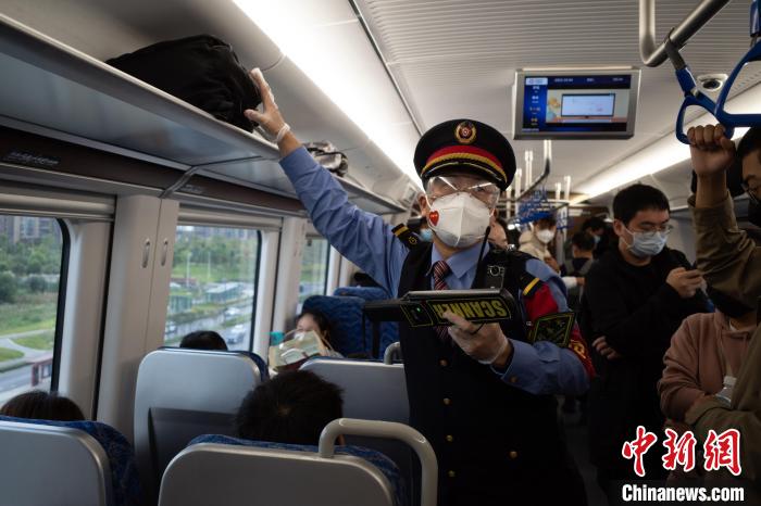 “請(qǐng)保管好自身財(cái)物,看管好小孩,照顧好老人,上下車注意腳下安全?!睌?shù)百名乘客陸續(xù)上車后,鐘靜開(kāi)始在車廂里巡視。疫情防控期間,他要提醒大家戴好口罩。遇到行李架上行李擺放不規(guī)范,他要?jiǎng)邮终怼M瑫r(shí),他還負(fù)責(zé)整列4節(jié)車廂的查票、補(bǔ)票工作。