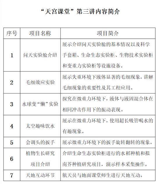 本次太空授課活動將繼續(xù)采取天地互動方式進(jìn)行,3名航天員將在軌介紹展示中國空間站問天實(shí)驗(yàn)艙工作生活場景,演示微重力環(huán)境下毛細(xì)效應(yīng)實(shí)驗(yàn)、水球變“懶”實(shí)驗(yàn)、太空趣味飲水、會調(diào)頭的扳手以及植物生長研究項(xiàng)目介紹,并與地面課堂進(jìn)行互動交流,旨在傳播普及載人航天知識,激發(fā)廣大青少年對科學(xué)的興趣。