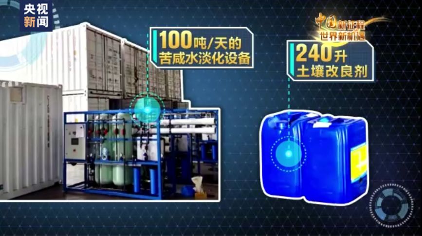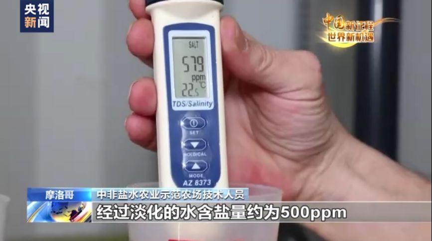 中非鹽水農(nóng)業(yè)示范農(nóng)場技術(shù)人員:經(jīng)過淡化的水含鹽量約為500ppm,而淡化之前,地下水的原本含鹽量可以看到是稍高于4000ppm。這真是太了不起了。