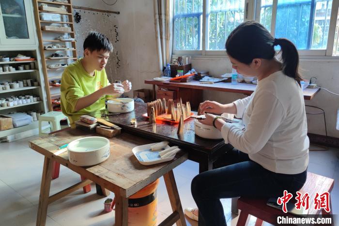 張才枝的兩個徒弟在學(xué)習(xí)制筆。 吳冠標(biāo) 攝