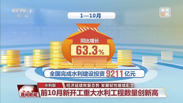1—10月,全國(guó)完成水利建設(shè)投資9211億元,同比增長(zhǎng)63.3%;較9月底增加投資975億元。
