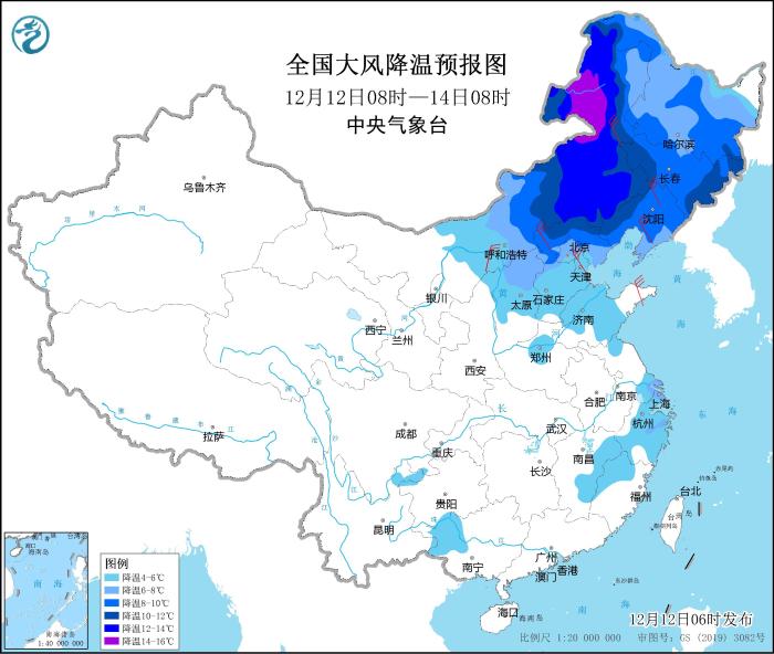 其中,12月12日08時至14日08時,內(nèi)蒙古中東部、東北地區(qū)大部、華北中北部、山東中部、河南北部、江南中東部等地氣溫將下降4~8℃,其中,內(nèi)蒙古東部、河北北部、遼寧西部、吉林西部等地部分地區(qū)降溫幅度可達10℃以上;上述部分地區(qū)并有4~6級偏北風,陣風7~8級。中央氣象臺12月12日06時繼續(xù)發(fā)布大風降溫預(yù)報。