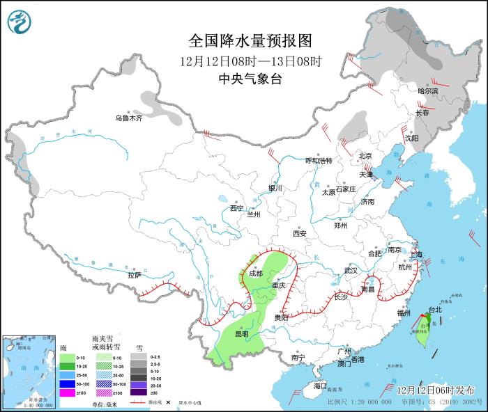 12月12日08時至13日08時,新疆阿勒泰和南疆盆地西部山區(qū)、內(nèi)蒙古中部和東北部、黑龍江、吉林中東部、遼寧東部等地的部分地區(qū)有小到中雪或雨夾雪。四川東部、云南東部和南部、臺灣島等地的部分地區(qū)有小雨,局地中雨。華北大部、東北地區(qū)大部、河南東部、山東半島等地的部分地區(qū)有4~6級風,其中,內(nèi)蒙古中西部等地部分地區(qū)有6~7級風(見圖3)。
