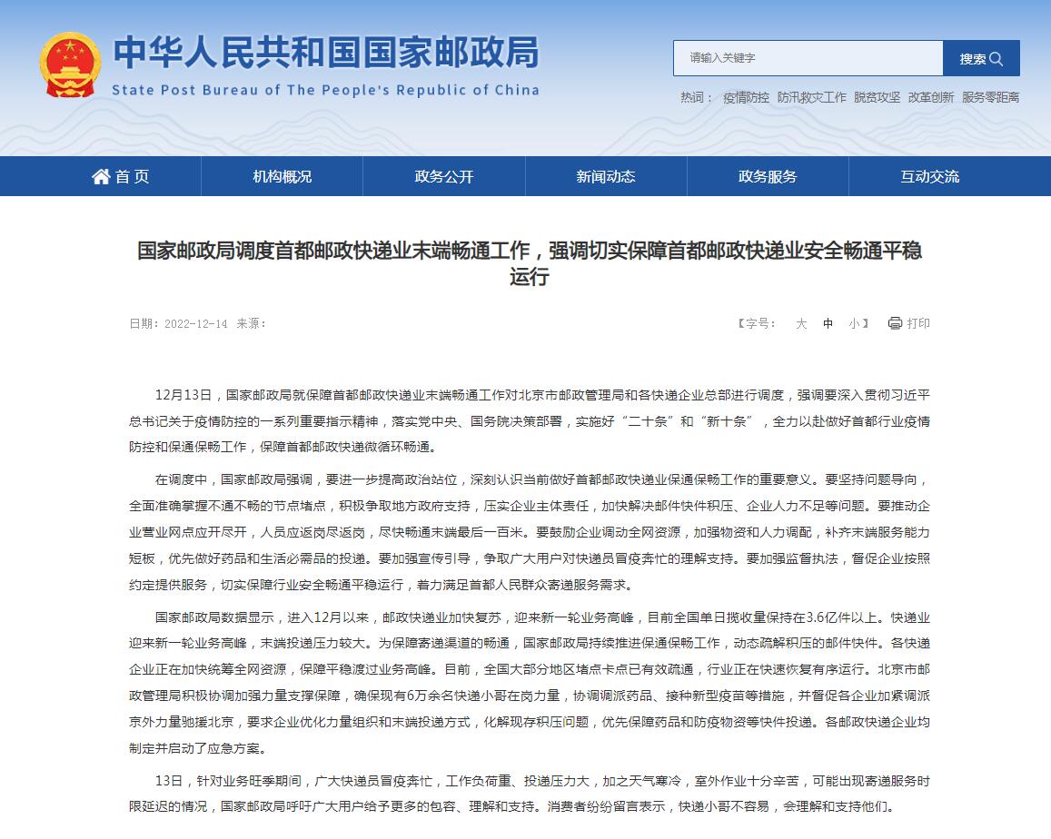 國家郵政局數(shù)據(jù)顯示,進入12月以來,郵政快遞業(yè)加快復蘇,迎來新一輪業(yè)務高峰,目前全國單日攬收量保持在3.6億件以上。快遞業(yè)迎來新一輪業(yè)務高峰,末端投遞壓力較大。為保障寄遞渠道的暢通,國家郵政局持續(xù)推進保通保暢工作,動態(tài)疏解積壓的郵件快件。各快遞企業(yè)正在加快統(tǒng)籌全網(wǎng)資源,保障平穩(wěn)渡過業(yè)務高峰。目前,全國大部分地區(qū)堵點卡點已有效疏通,行業(yè)正在快速恢復有序運行。北京市郵政管理局積極協(xié)調(diào)加強力量支撐保障,確保現(xiàn)有6萬余名快遞小哥在崗力量,協(xié)調(diào)調(diào)派藥品、接種新型疫苗等措施,并督促各企業(yè)加緊調(diào)派京外力量馳援北京,要求企業(yè)優(yōu)化力量組織和末端投遞方式,化解現(xiàn)存積壓問題,優(yōu)先保障藥品和防疫物資等快件投遞。各郵政快遞企業(yè)均制定并啟動了應急方案。