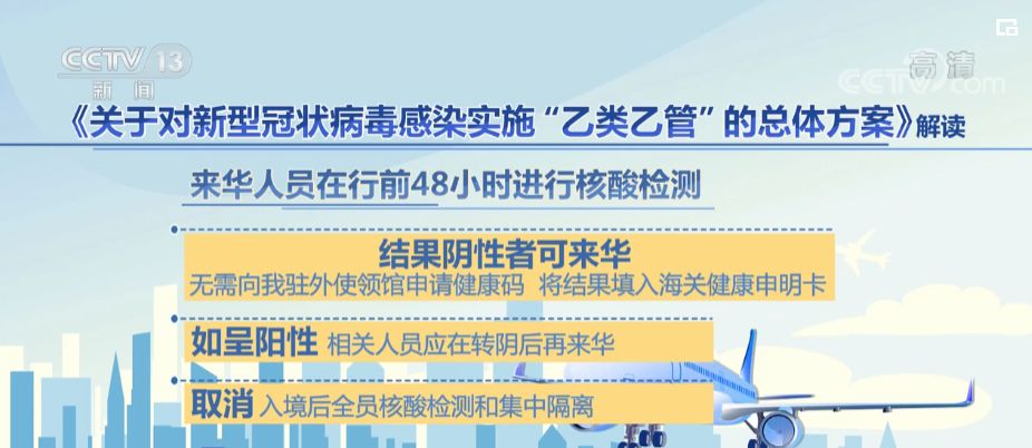 按照《總體方案》要求,來(lái)華人員在行前48小時(shí)進(jìn)行核酸檢測(cè),結(jié)果陰性者可來(lái)華,無(wú)需向我駐外使領(lǐng)館申請(qǐng)健康碼,將結(jié)果填入海關(guān)健康申明卡。如呈陽(yáng)性,相關(guān)人員應(yīng)在轉(zhuǎn)陰后再來(lái)華;取消入境后全員核酸檢測(cè)和集中隔離。健康申報(bào)正常且海關(guān)口岸常規(guī)檢疫無(wú)異常者,可放行進(jìn)入社會(huì)面;取消“五個(gè)一”及客座率限制等國(guó)際客運(yùn)航班數(shù)量管控措施;各航空公司繼續(xù)做好機(jī)上防疫,乘客乘機(jī)時(shí)須佩戴口罩;進(jìn)一步優(yōu)化復(fù)工復(fù)產(chǎn)、商務(wù)、留學(xué)、探親、團(tuán)聚等外籍人士來(lái)華安排,提供相應(yīng)簽證便利。逐步恢復(fù)水路、陸路口岸客運(yùn)出入境。根據(jù)國(guó)際疫情形勢(shì)和各方面服務(wù)保障能力,有序恢復(fù)中國(guó)公民出境旅游。