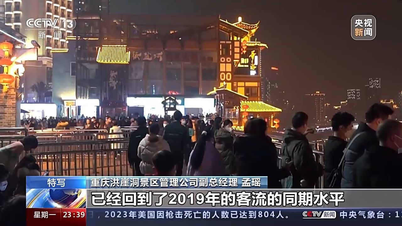 重慶洪崖洞景區(qū)管理公司副總經(jīng)理 孟瑤:本來按照我們的預(yù)估,可能會在今年的二到三月份,游客量會有一個明顯的回升。元旦的第一天和第二天,我們的客流分別已經(jīng)達到了6.4萬和6.2萬,已經(jīng)回到了2019年的客流的同期水平,甚至已經(jīng)超過了17%。