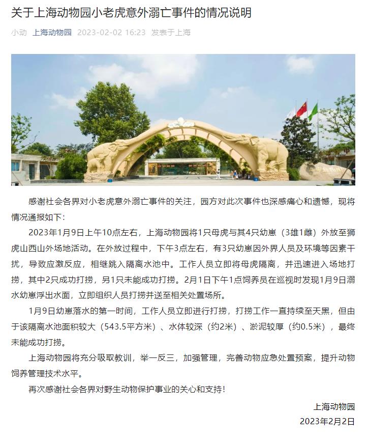 中新網(wǎng)2月2日電 據(jù)“上海動(dòng)物園”微信公眾號(hào)消息,上海動(dòng)物園2日發(fā)布關(guān)于上海動(dòng)物園小老虎意外溺亡事件的情況說明,2023年1月9日上午10點(diǎn)左右,上海動(dòng)物園將1只母虎與其4只幼崽(3雄1雌)外放至獅虎山西山外場地活動(dòng)。在外放過程中,下午3點(diǎn)左右,有3只幼崽因外界人員及環(huán)境等因素干擾,導(dǎo)致應(yīng)激反應(yīng),相繼跳入隔離水池中。工作人員立即將母虎隔離,并迅速進(jìn)入場地打撈,其中2只成功打撈,另1只未能成功打撈。2月1日下午1點(diǎn)飼養(yǎng)員在巡視時(shí)發(fā)現(xiàn)1月9日溺水幼崽浮出水面,立即組織人員打撈并送至相關(guān)處置場所。