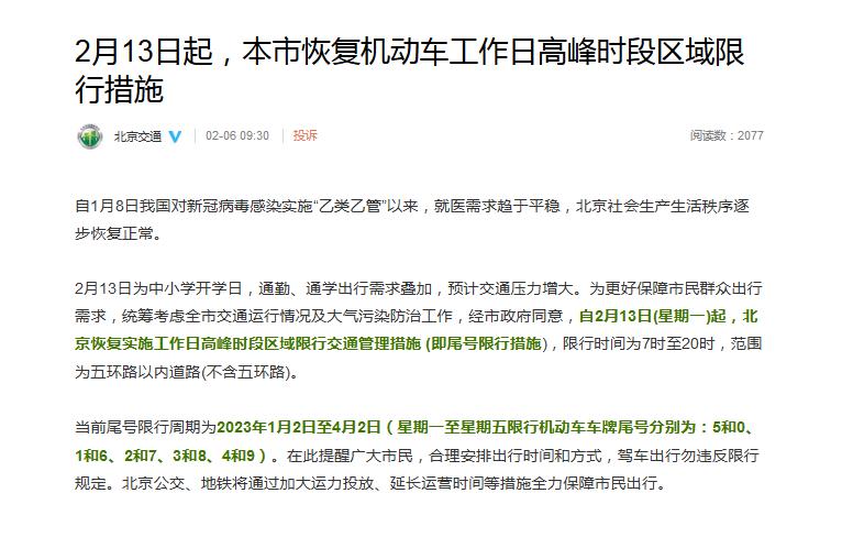 2月13日為中小學(xué)開學(xué)日,通勤、通學(xué)出行需求疊加,預(yù)計(jì)交通壓力增大。為更好保障市民群眾出行需求,統(tǒng)籌考慮北京全市交通運(yùn)行情況及大氣污染防治工作,經(jīng)北京市政府同意,自2月13日(星期一)起,北京恢復(fù)實(shí)施工作日高峰時(shí)段區(qū)域限行交通管理措施(即尾號(hào)限行措施),限行時(shí)間為7時(shí)至20時(shí),范圍為五環(huán)路以內(nèi)道路(不含五環(huán)路)。