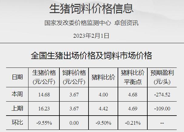 中新網(wǎng)2月6日電 據(jù)國(guó)家發(fā)改委價(jià)格監(jiān)測(cè)中心網(wǎng)站消息,截至2023年2月1日當(dāng)周,全國(guó)豬料比價(jià)為4.00,較春節(jié)前(1月18日)下降9.50%。按目前價(jià)格及成本推算,未來生豬養(yǎng)殖頭均虧損為274.52元。當(dāng)周國(guó)內(nèi)豬價(jià)以降為主。隨著春節(jié)假期收尾,終端消費(fèi)漸顯疲軟,屠宰企業(yè)開工率低位調(diào)整,整體收購(gòu)難度不大,壓價(jià)情緒較濃,而養(yǎng)殖端雖有抗價(jià)情緒,但生豬出欄壓力仍存,周內(nèi)豬價(jià)小幅走低。