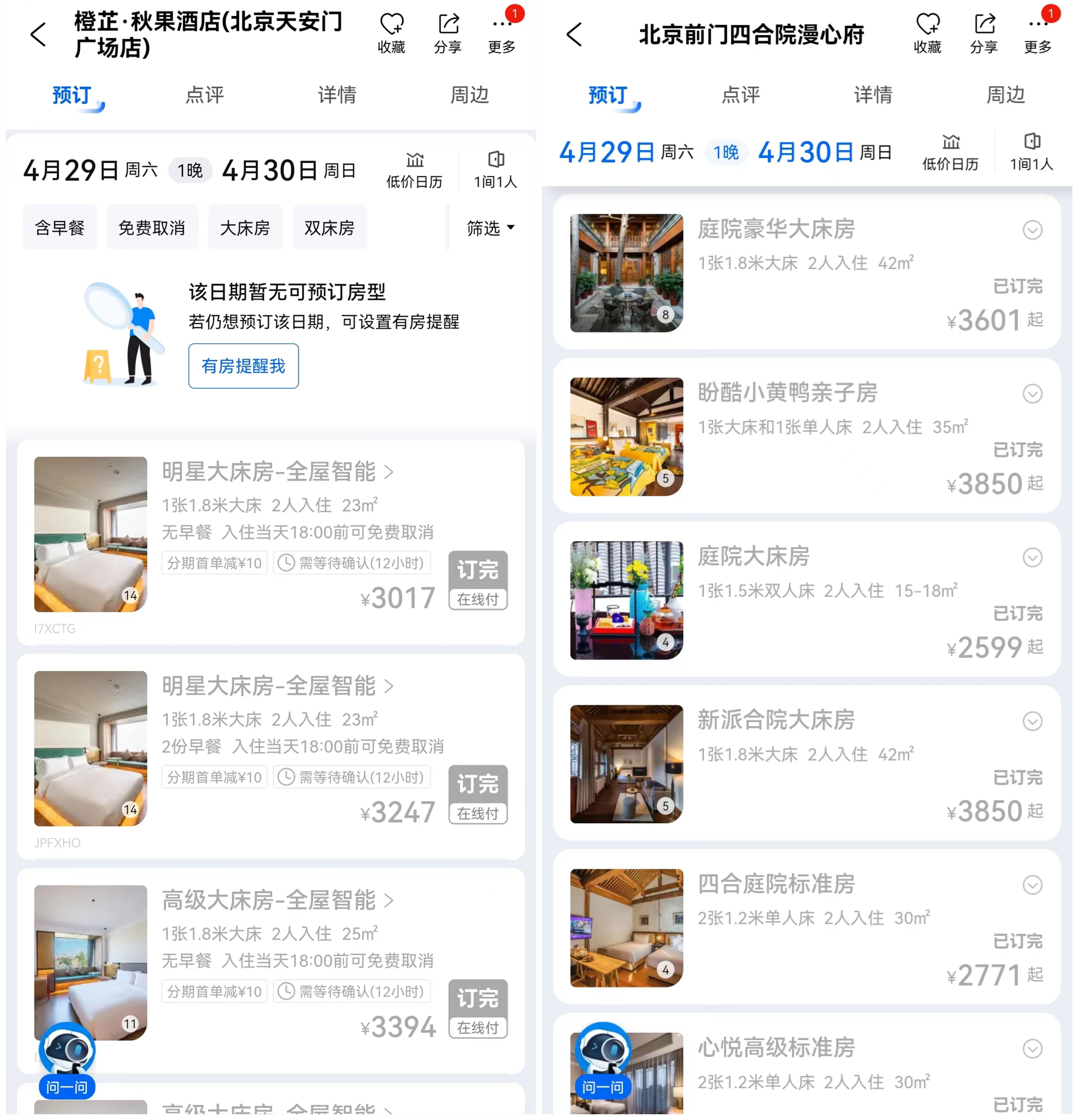 北京天安門附近有酒店已顯示滿房,或多個(gè)房型訂滿。截圖來(lái)源:攜程旅行App