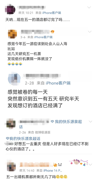 社交平臺(tái)上,多名網(wǎng)友早已規(guī)劃好了自己“五一”出行的計(jì)劃,并已提前購(gòu)買機(jī)票和酒店,面對(duì)緊俏的旅游產(chǎn)品,有網(wǎng)友驚呼:“現(xiàn)在就已經(jīng)訂不到房了嗎?”“低價(jià)機(jī)票隔一會(huì)兒就沒(méi)了!”
